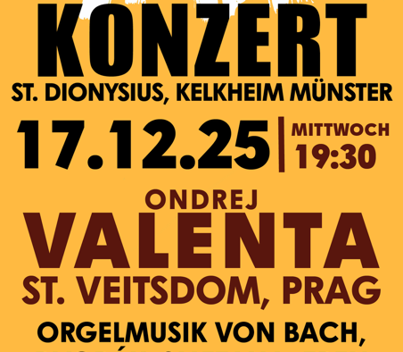 Am Mittwoch, 17. Dezember 2025, dürfen wir uns auf ein ganz besonderes MEISTERKONZERT freuen: Ondřej Valenta, Hauptorganist des berühmten St. Veitsdoms in Prag, kommt nach St. Dionysius in Kelkheim-Münster!